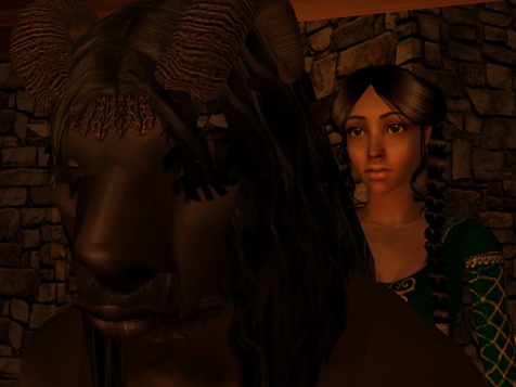 He stared at her a few seconds longer, and then he laid his broad palm over the mask and lifted it free with a faint clanking of iron against horns. With a very human gesture, he hastily wiped the sweat from his face with the back of his arm. Then he let his arm fall, and Eithne saw just how inhuman he was.