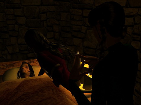 She took Lasrua’s hand and pulled her stumbling to the bedside.