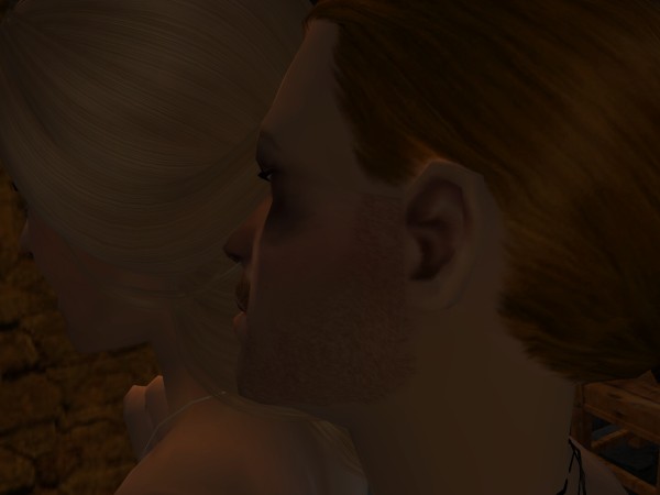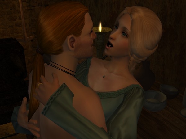 The smith seemed to decide her immobility was assent, for he exhaled deeply a last time and began kissing her neck truly: hot, wet kisses with dabs of tongue behind her ears; firm nibbles of his lips down her neck and shoulder; and when her awkward writhing turned her head towards his, hungry kisses to her jawbone, as though he longed to reach her lips.
