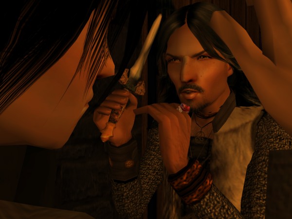 “Believe this?” he snarled. He lowered the knife to the level of Finn’s throat and shook him again. “Believe this? Do I have to slit the throat of your maid’s little sweetheart to show you what they’ll do to your man if they catch him? Do I have to bend your maid over the bed and show you what Muirgius will do to you if he catches you, lady? Eh, now?”