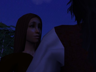She could not look at him. When she looked up at him, she saw only the shadow of his head, and the starry sky behind. She did not like to see him as a shadow.