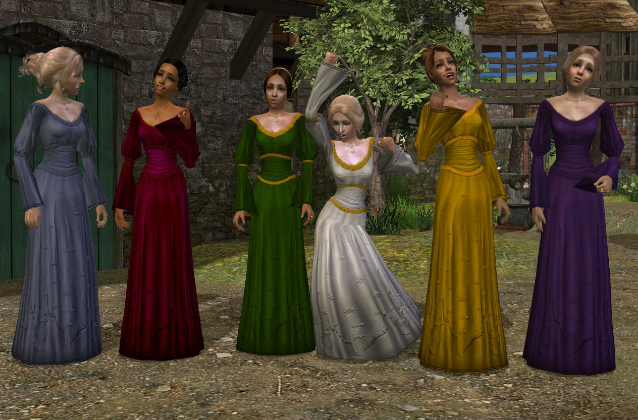 I’ve posted download links to these dresses before, so long-time readers and medieval Simmers probably have them already. But I’ve never had preview pictures or a proper post for them until now, so here they are.