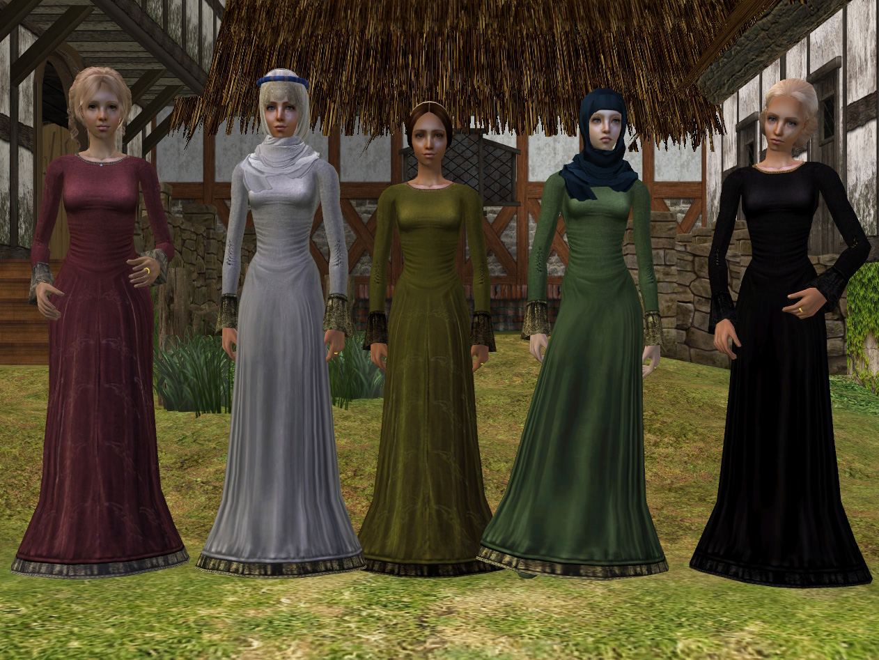 I like this mesh because it is a little larger in the bust and derriere. In the picture below, Lady Eadgith is wearing a dress with the usual bust for medieval dress meshes. Eadie is wearing the mesh I used for my recolors.