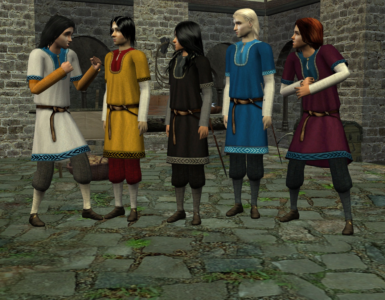 This set features a brand new texture, and makes use of G-Knee’s teen version of iamliz’s Russian Viking Tunic. I call it the “Saxon Collar” set because it all started with the Saxon-style collar on the outer tunic, which fastens with a small silver or gold brooch.