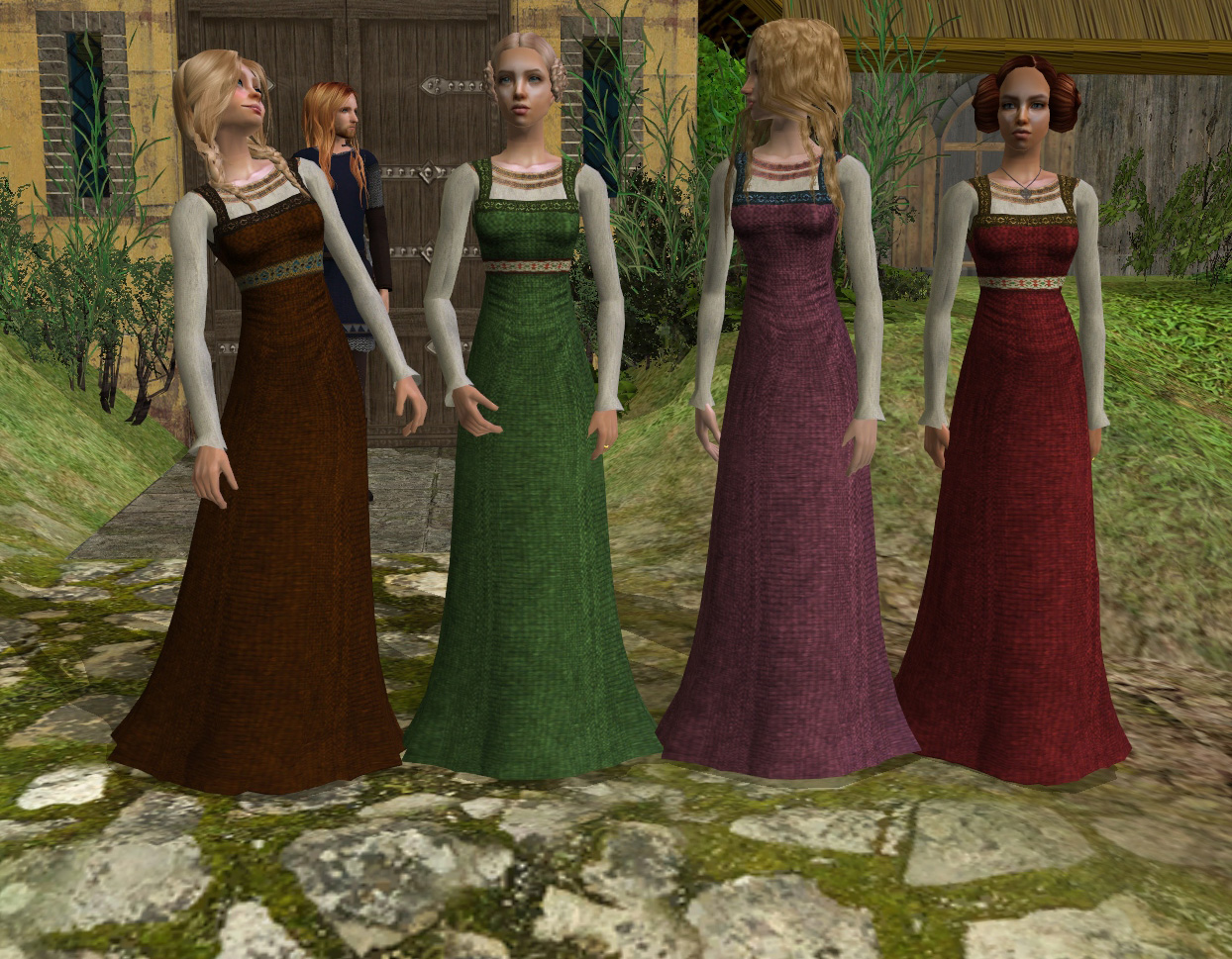 In honor of the first anniversary of The Medieval Smithy I have remixed some classic medieval outfits for Sims 2 men, using some of the more authentic tunic meshes that have been created in recent years.